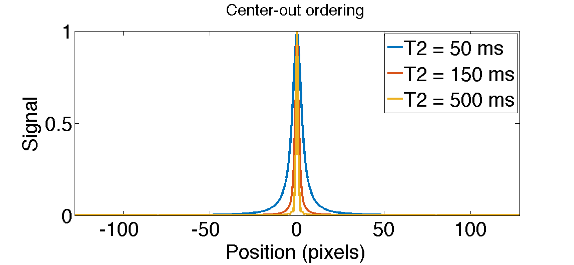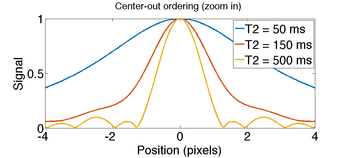randshuffle = false; psf_1d(T2vals, ETL, TE, randshuffle, normalize_psfs, true, fignum + 0); ftitle('Center-out ordering (zoom in)', 32); psf_1d(T2vals, ETL, TE, randshuffle, normalize_psfs, false, fignum + 1); ftitle('Center-out ordering', 32);