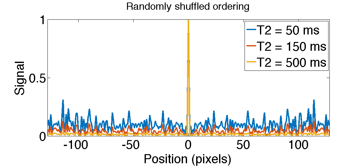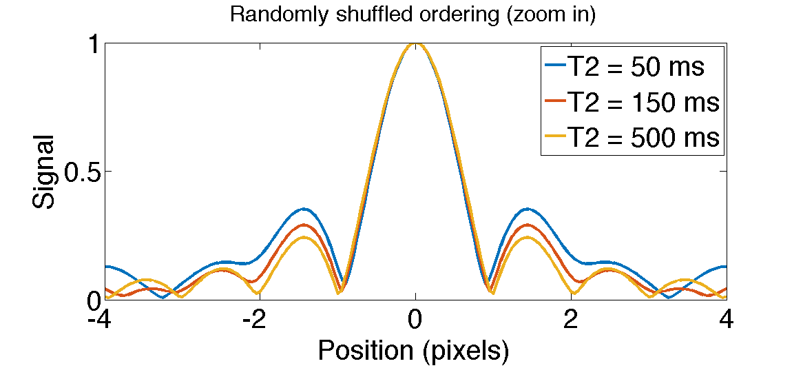 randshuffle = true; psf_1d(T2vals, ETL, TE, randshuffle, normalize_psfs, true, fignum + 2); ftitle('Randomly shuffled ordering (zoom in)', 32); psf_1d(T2vals, ETL, TE, randshuffle, normalize_psfs, false, fignum + 3); ftitle('Randomly shuffled ordering', 32);